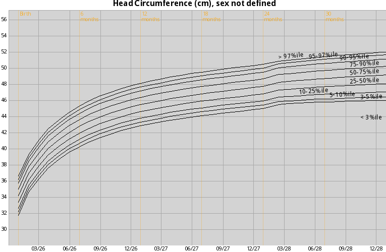 Plots head circumference (in centimeters) based on the WHO growth charts for <= 2 years and the CDC growth charts for older than 2. The change in data source creates a slight "jog" in the graph at the 24-month point. Data for children with Down Syndrome are from Palmer, et al. (1992). Head circumference of children with Down syndrome (0-36 months), American Journal of Medical Genetics, 42, 61-67, via Greg Richards at growthcharts.com